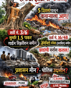 पुणे शहरातील खराडी परिसरात सर्वे नं. 3/6 येथील सुमारे दीड एकर गार्डन रिझर्वेशन जमिनीवर शेकडो प्राणवायू देणाऱ्या झाडांची कथितपणे कत्तल करण्यात आल्याचा गंभीर प्रकार उघडकीस आला आहे. या जागेवर व्यावसायिक इमारतींचा राडारोडा व कचरा टाकण्यात येत असून, मागील पाच दिवसांपासून या कचऱ्याला सतत आग लागत असल्याची धक्कादायक माहिती समोर आली आहे.