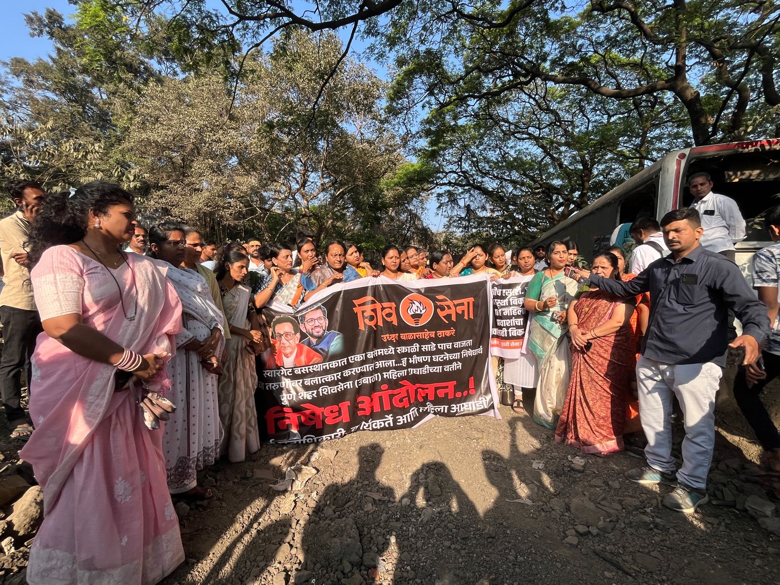 सदर घटना शिवसैनिकांना कळताच शिवसेना महिला आघाडीच्या वतीने स्वारगेट बसस्थानकात सर्व महिला पदाधिकारी मोठ्या प्रमाणात जमल्या शिवसेना महिला आघाडी, युवती सेना पदाधिकारी यांच्या वतीने महिला सुरक्षा, पोलिस यंत्रणा, परिवहन मंडळाची सुरक्षा व्यवस्था आणि आरोपी यांच्या विरोधात निदर्शने करून आंदोलन करण्यात आले, तसेच राज्य संघटक वसंत मोरे आणि शिवसैनिकांनी यावेळी स्वारगेट परिवहन मंडळाचे सुरक्षा रक्षक केबिन फोडून टाकले आणि प्रशासनाचा निषेध केला . यावेळी परिवहन मंत्री सरनाईक , गृहमंत्री फडणवीस यांच्या विरोधात घोषणा देण्यात आल्या महिलांच्या सुरक्षेचा प्रश्न उपस्थित केले गेला.