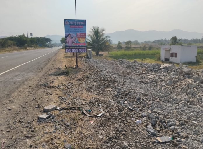 राष्ट्रीय महामार्गालगत उभारलेला संरक्षण कट्टा (रस्ता सुरक्षा भिंत) अनधिकृत प्लॉटिंगसाठी जाणीवपूर्वक तोडण्यात आल्याचा गंभीर आरोप स्थानिक नागरिकांनी केला आहे. घटनास्थळी मोठ्या प्रमाणावर दगडांचे ढिगारे, सिमेंटचे अवशेष व लोखंडी सळई पडून राहिली असून, हा कट्टा काढून टाकल्यानंतर जमीन सपाट करून पुढील प्लॉटिंग कामासाठी जागा मोकळी करण्यात आल्याची शंका व्यक्त होत आहे.