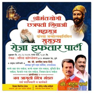 पुणे शहरातील मंगलवार पेठ परिसरातील मदीना कॉम्प्लेक्स (मकान नं. 416) येथे शुक्रवार दिनांक 6 मार्च 2026 रोजी सायंकाळी 6.45 वाजता *श्रीमंतयोगी छत्रपती शिवाजी महाराज यांच्या जयंतीनिमित्त “सुराज्य रोजा इफ्तार पार्टी”*चे आयोजन करण्यात आले. हा कार्यक्रम नवजागृती मित्र मंडळाचे अध्यक्ष राहुलभाऊ शर्मा यांच्या पुढाकारातून आयोजित करण्यात आला होता.