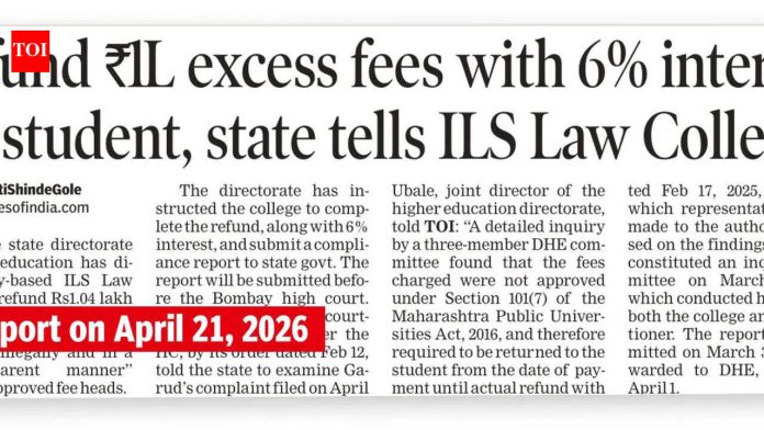 पुणे: आयएलएस लॉ कॉलेजच्या माजी विद्यार्थ्यांनी संस्थेच्या अध्यक्षांना पत्र लिहून बेकायदेशीर शुल्क वसुली, विद्यार्थ्यांचे आंदोलन दडपून टाकणे, पारदर्शकतेचा अभाव आणि प्रशासनातील गंभीर त्रुटी या आरोपांच्या पार्श्वभूमीवर संस्थेच्या कामकाजात तातडीने सुधारणा करण्याची मागणी केली आहे.23 एप्रिल 2026 रोजीचे पत्र, महाविद्यालयात सुरू असलेल्या फीच्या रांगेत आले आहे, जिथे विद्यार्थ्यांनी प्रशासनावर अनधिकृत किंवा जास्त शुल्क आकारल्याचा आरोप केला आहे आणि परताव्याची मागणी केली आहे. राज्य सरकारने संबंधित प्रकरणात कारवाई करण्याचे आदेश दिले आहेत.ILS च्या गव्हर्निंग कौन्सिलचे अध्यक्ष एसव्ही कानेटकर यांनी मंगळवारी TOI ला सांगितले की ते प्रवास करत होते आणि 30 एप्रिलपर्यंत पुण्यात परतल्यानंतर या प्रकरणाची चौकशी करू. “विद्यार्थ्यांनी केलेले सर्व दावे खोटे आहेत. आम्ही आमची बाजू नंतरच्या काळात स्पष्ट करू,” तो म्हणाला.विद्यार्थ्यांचे समर्थन करताना, ILS माजी विद्यार्थ्यांनी दावा केला की योग्य प्रकटीकरण न करता, “पारदर्शक आणि बेकायदेशीर” पद्धतीने अनेक शीर्षकाखाली फी गोळा केली गेली. “हा निधी कसा वापरला गेला याची माहिती विद्यार्थी आणि पालकांना कधीच दिली गेली नाही,” असे पत्रात म्हटले आहे, कॉलेज व्यवस्थापनाकडून जबाबदारी घेण्याची मागणी केली आहे.माजी विद्यार्थ्यांच्या पत्रात विद्यार्थ्यांचे आंदोलन ज्या पद्धतीने हाताळले गेले त्यावरही टीका करण्यात आली आहे. गेल्या वर्षी झालेल्या निषेधाचा संदर्भ देत, त्यांनी आरोप केला की प्रशासनाने विद्यार्थ्यांना शिस्तभंगाच्या कारवाईचा इशारा दिला आणि निषेध रोखण्यासाठी कॅम्पसमध्ये पोलिस कर्मचारी तैनात केले. “विद्यार्थी महाविद्यालयाच्या निर्णयांवर प्रश्नचिन्ह उपस्थित करू शकत नाहीत का? जर टीका दडपली गेली तर उत्तरदायित्व अस्तित्वात नाही,” असे पत्रात म्हटले आहे.व्यापक प्रशासनाची चिंता वाढवत, माजी विद्यार्थ्यांनी आर्थिक अनियमितता आणि कॅम्पस सुविधांशी संबंधित तक्रारींचे निराकरण करण्यात पारदर्शकतेचा अभाव असल्याचा आरोप केला. त्यांनी असा दावा केला की जेव्हा काही प्रकरणांमध्ये अंतर्गत कारवाई करण्यात आली तेव्हा कोणताही तपशीलवार अहवाल विद्यार्थ्यांसोबत शेअर केला गेला नाही.